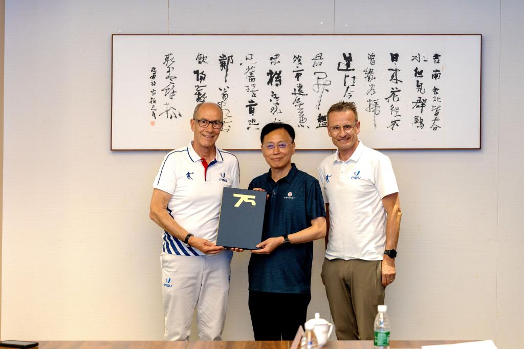 国际大体联主席雷诺·艾德一行到校考察6月13日下午,国际大体联主席雷诺·艾德,国际大体联秘书长马蒂亚斯·雷蒙德,国际大体联夏季大运会部主任赵晶一行到校考察。党委书记刘强热情接待雷诺·艾德一行,陪同参观考察并座谈。党委常委、副校长彭晓琳,市体育局副局长盛钢一同接待。雷诺·艾德一行首先来到传统工艺研究院参观。在成都大运会举办期间,这里是颇受运动员和随团官员欢迎的中华文化体验区。雷诺·艾德一行饶有兴味地听取讲解,一边了解蜀锦蜀绣、漆艺、陶艺等背后的中华文化意涵,一边亲身体验扎染技艺制作T恤衫。在第三运动场,学校棍网球队...162025-06