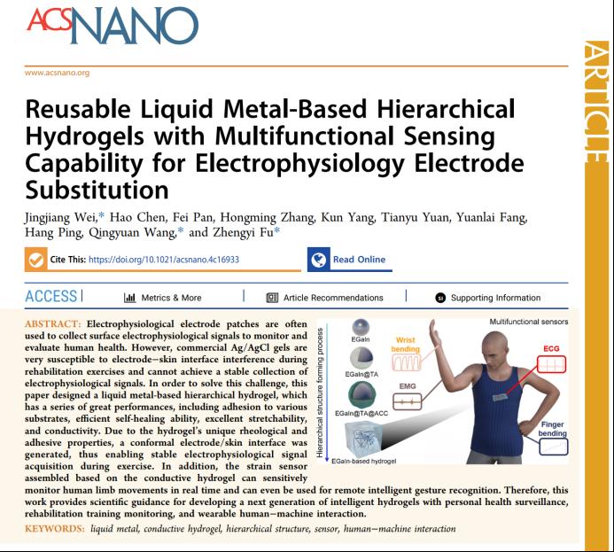 近日,我校高等研究院特聘研究员魏竟江博士和王清远教授与武汉理工大学傅正义院士合作,在材料科学领域顶级期刊ACS Nano(中科院一区Top期刊,影响因子IF:15.8)发表了题为"Reusable Liquid Metal-Based Hierarchical Hydrogels with Multifunctional Sensing Capability for Electrophysiology Electrode Substitution"的研究论文。太阳成集团tyc122cc入口为第一单位,魏竟江博士为论文第一作者和共同通讯作者,硕士生陈昊为共同第一作者,王清远教授、傅正义院士为共同通讯作者。