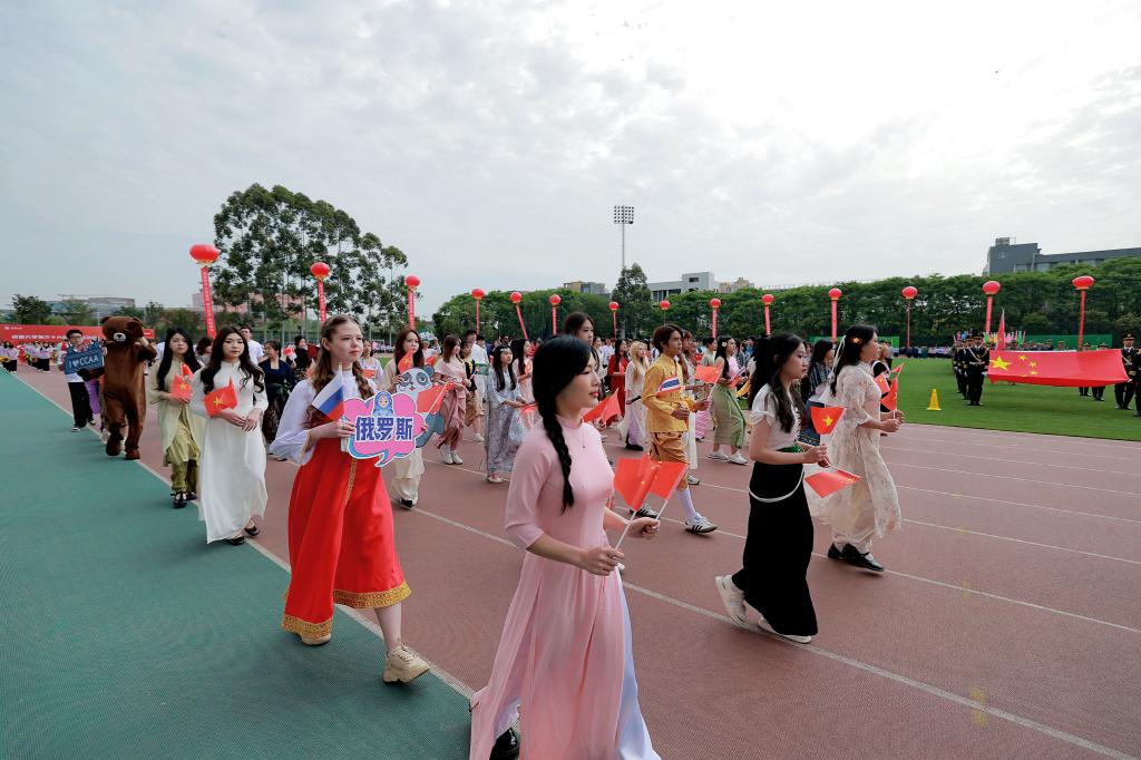 电子信息与电气工程学院别开生面的“人”“机”舞狮,灵动可爱,生动演绎“人机协同”的未来图景;文学与新闻传播学院汉服展演,带领观众沉浸式领略文化底蕴;影视与动画学院“吒儿”、敖丙联袂出场,热力舞动,展现出学院学科专业特色和硬核实绩;音乐与舞蹈学院学生的中国舞跳、转、翻、软开四个技术展示,尽显不凡“舞功”。中国-东盟艺术学院国际部留学生“海橙”身着本国服饰,带来传统民族舞蹈表演。各方阵紧扣各自特色,展示工作,展现特色,尽显成大师生的多元风采与无限创意。