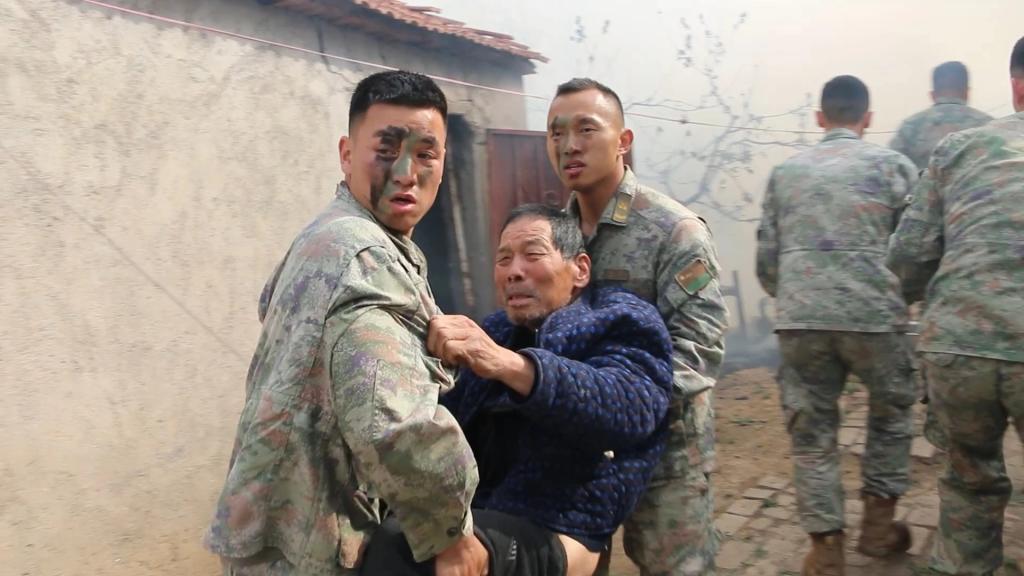 水管接水太慢,官兵们提上水桶冲向河边,越过院墙,弯腰汲水,再把一桶桶水往大火里送。张艺站在院墙上,从战友手中接过半人高的水桶时,脚下踩空,摔到泥地上,顾不上站起来看看伤口拍拍泥,被战友拉起来,他就立马抱起水桶递给下一个人。