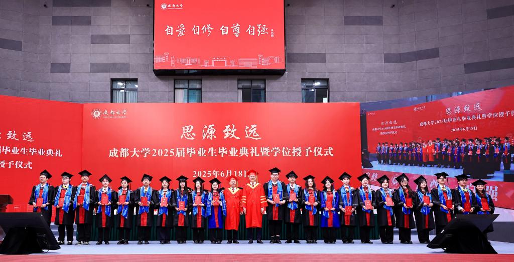党委书记刘强为2025届四川省优秀大学毕业生代表颁发荣誉证书。党委副书记、校长朱明以“坚定坚强坚守坚持在坚韧中成长”寄语毕业生。