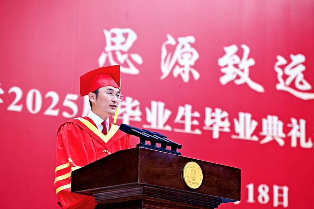 朱明与毕业生们分享四句话:一是要学会坚定,始终有初心、有情怀。“情怀”是超越小我、心系社会、家国的担当,是对真理的敬畏、对美好的向往。人生的磨炼,是在处理我们的情绪,修炼自己的内心。面对人生路的迷茫,要修炼“行到水穷处,坐看云起时”的通透。面对成长中的挫折,要秉持“千磨万击还坚劲,任尔东西南北风”的刚毅。人生得意时,要听得见“遥远的哭声”;人生失意时,要看得见“心底的星光”,守护心中那团火,永怀肩头那份情。二是要学会坚强,始终不畏苦、不畏难。同学们正处于苦练本领、增长才干的黄金时期。要下得苦功夫、练得真本领,勇于到发展一线、基层一线去担苦、担难、担重、担险。坚决摒弃躺平、佛系思想,积极投身科技创新、文化传承、乡村振兴等国家发展的大舞台,实实在在用智慧和汗水实现自己的价值。三要学会坚守,始终明定位、勇担当。要找到自己的核心优势,找到自己真正热爱和擅长的事,在这个变革的时代,沉住气、稳住心,担国家责、做国家事!像北斗卫星中那颗耐高温、抗辐射的“平凡螺丝钉”一样,在各自平凡岗位上发挥支撑作用,在强国建设、民族复兴伟业中展现青春作为,彰显青春风采,贡献青春力量。四是要学会坚持,始终踏实地、干实事。从理想到现实之间最短的距离就是行动,同学们不要做悬浮的“理念巨人”,要当破土的“行动种子”。真正的坚持,是心无旁骛的专注,不纠结他人目光,不纠缠琐碎纷扰,一个行动N次,养成一种习惯;一种习惯N次,炼成一种性格;一种性格N年沉淀,收获一种命运。积点滴之功,必筑磅礴之势,必成就出彩人生!朱明最后说到,“你们永远是学校和老师的荣光与牵挂,祝福同学们,不是年复一年变老,而是年复一年焕新!从成大出发,成大人、成大才、成大事!”