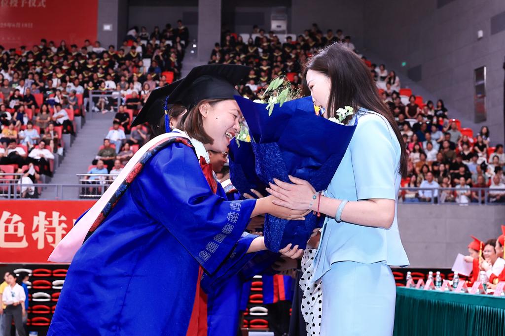 典礼现场,毕业生代表还为教师、辅导员、机关行政、实验教辅、医护人员、宿管、食堂、保洁、维修及安保人员代表敬献鲜花。