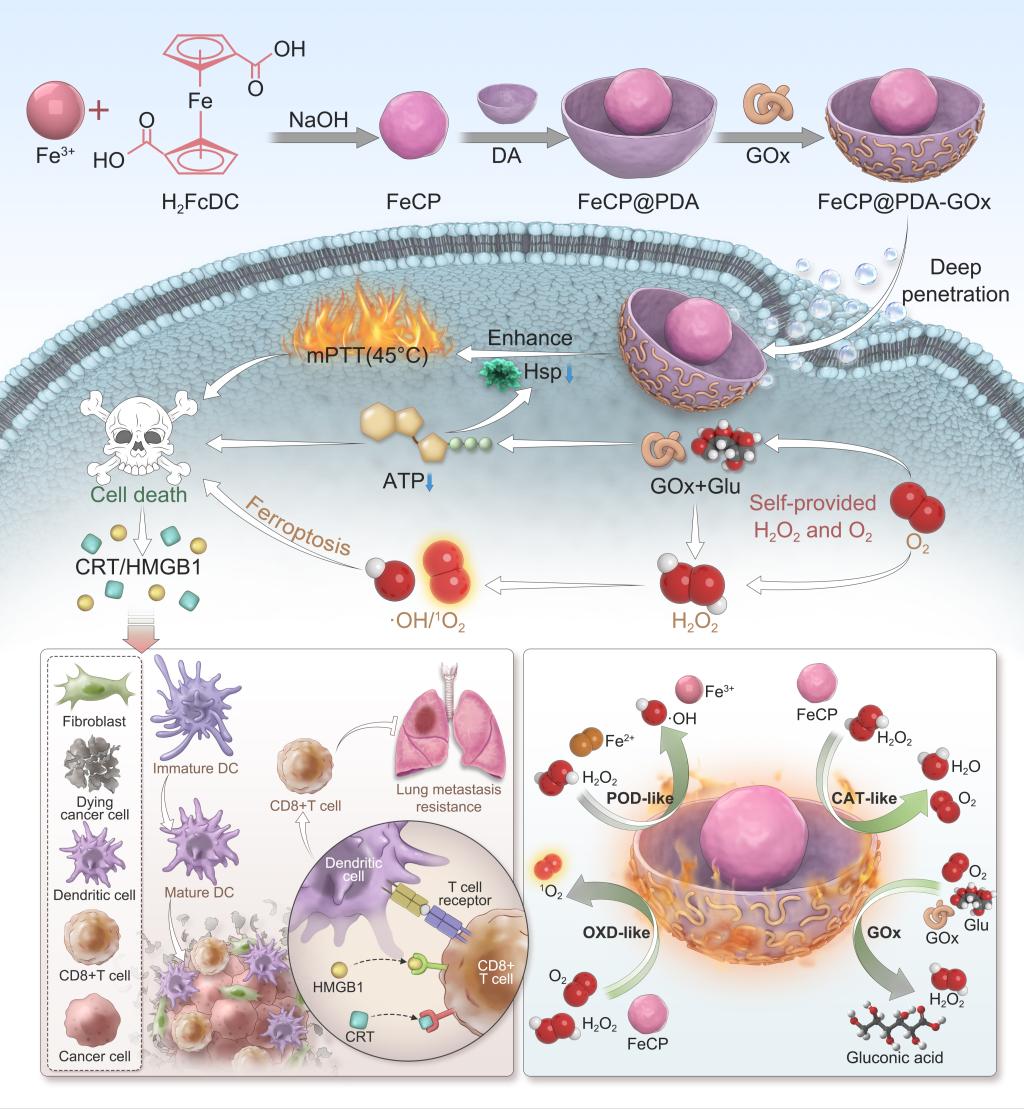 黑色素瘤具有生长迅速、侵袭性强等特征,导致其恶性程度极高,并具有显著的转移倾向。当前常用的治疗手段,如化疗和放疗,因其严重的副作用及免疫抑制作用,治疗效果有限。因此,开发精准且高效的综合治疗策略显得尤为重要。在此,我们构建了一种具有多功能和多酶活性的碗状纳米系统(FeCP@PDA-GOx),实现了饥饿疗法、化学动力学疗法、温和光热疗法(mPTT)与免疫疗法的协同整合,旨在达成多维度的治疗效果。该纳米平台利用葡萄糖氧化酶(GOx)、过氧化物酶(POD)、氧化酶(OXD)和过氧化氢酶(CAT)等多种酶的催化活性。CAT样活性生成的O?在碗状纳米粒子开口处积聚,产生推进力,纳米粒子追踪分析(NTA)显示FeCP@PDA-GOx在37°C的葡萄糖溶液中表现出显著的运动性,这不仅增加了纳米粒的细胞摄取,肿瘤球摄取,同时促进溶酶体逃逸作用。通过transwell模型,上层为肿瘤细胞或内皮细胞,来检测下层肿瘤细胞的摄取,模拟从血管渗入肿瘤和肿瘤细胞间的穿透能力。并在小鼠肿瘤模型上显示出增强的蓄积和渗透。