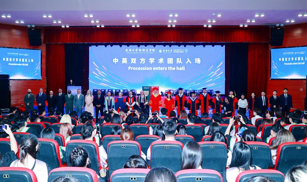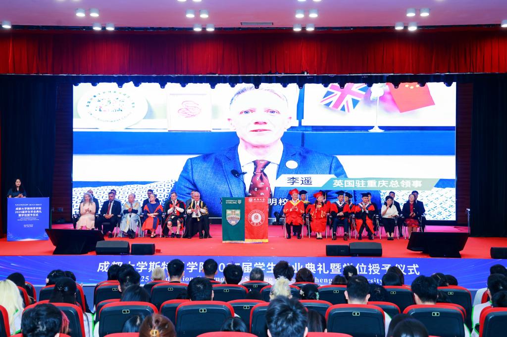 朱明代表全体师生向出席典礼的嘉宾表示感谢,祝贺圆满完成学业的斯特灵学院首届毕业生!朱明细数同学们四年成长点滴:作为学院自2021年成立以来的首届毕业生,你们在这里镌刻了自己的青春印记,更见证了中英合作办学的生动实践,你们学术与创新并进,视野与担当同行、多元文化共融,你们是学院历史的开创者、学院精神的奠基者,更是成大国际化征程的闪耀名片!