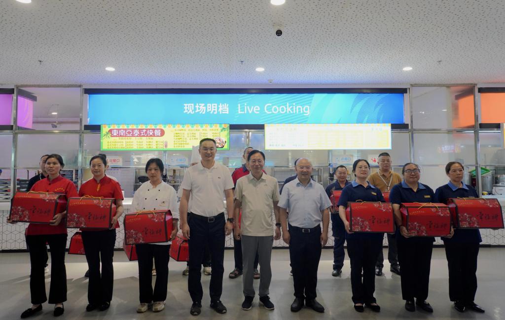 来到五食堂,校领导为后勤服务人员送上慰问礼包,叮嘱大家在忙碌工作的同时一定要注意防暑降温,要绷紧食品安全这根弦,不断提升菜品质量与服务水平,让师生们吃得放心、吃得舒心,为师生员工持续提供安全健康贴心的餐饮服务。