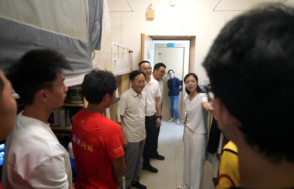 学生宿舍14栋住着学校棍网球队、篮球队的队员,得知他们暑假仍在坚持训练,为下半年的竞赛做准备,校领导叮嘱他们要做好防暑降温,注意训练安全。在食品与生物工程学院学生寝室,校领导详细询问了留校备战的考研学子的学习和生活情况,鼓励同学们科学规划、专注复习。校领导为宿管人员送上慰问礼包,希望他们始终把学生放在心上,用细致关怀温暖每一位学子,主动倾听并及时回应学生的需求与诉求,全力为学生的成长成才筑牢温馨舒适的生活港湾。