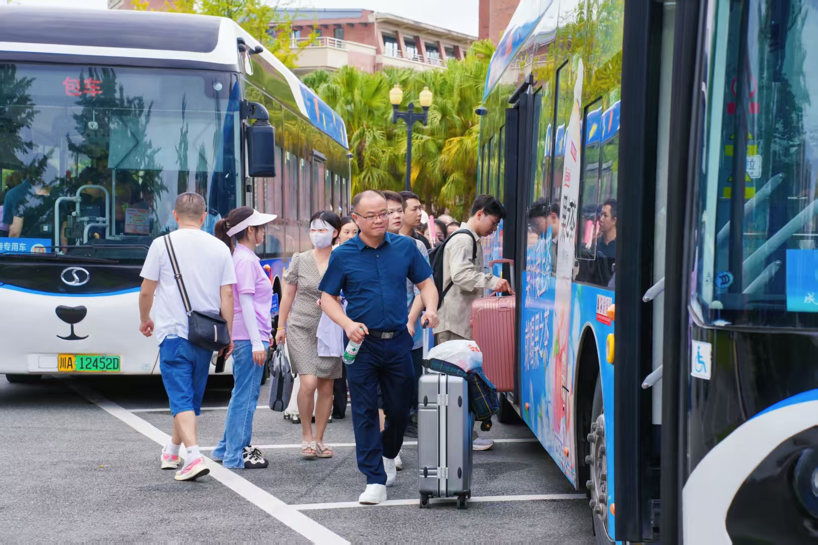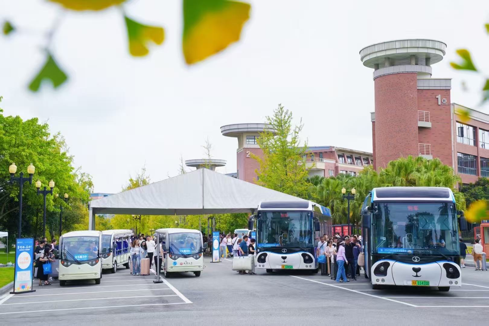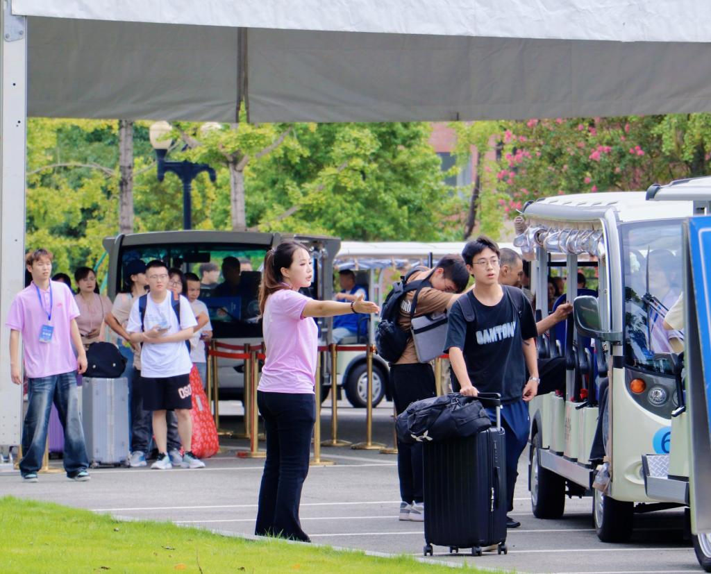 学校南大门和东南门是新生入校第一站。在两个进校主入口,身着紫粉色T恤的志愿者热情提供引导帮助,协助新生和家长搬运行李,乘车抵至宿舍楼栋报到点。今年,校团委共组织400余名学生志愿者参与迎新服务,成为新生入校的第一位“贴心人”。18辆公交大巴、15台校园交通车“小白龙”往来穿梭,解决到寝“最后一公里”。