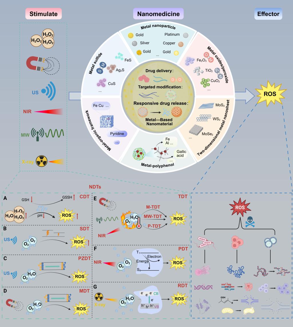 金属基纳米材料(Metal-Based Nanomaterials,MBNs)是纳米医学领域一个充满活力的前沿研究方向,为下一代诊断和治疗技术提供了多功能平台。其可调控的结构以及催化、光学和磁性等特性,使其能够用于各种纳米动力学疗法(Nanodynamic Therapies,NDTs),包括光动力疗法、化学动力疗法、声动力疗法、热动力疗法、压电疗法、放射动力疗法和磁动力疗法等。除了已知的肿瘤杀伤作用外,MBNs还具有强大的抗菌和抗病毒活性,其作用机制包括产生活性氧、调节免疫系统和破坏生物膜等。