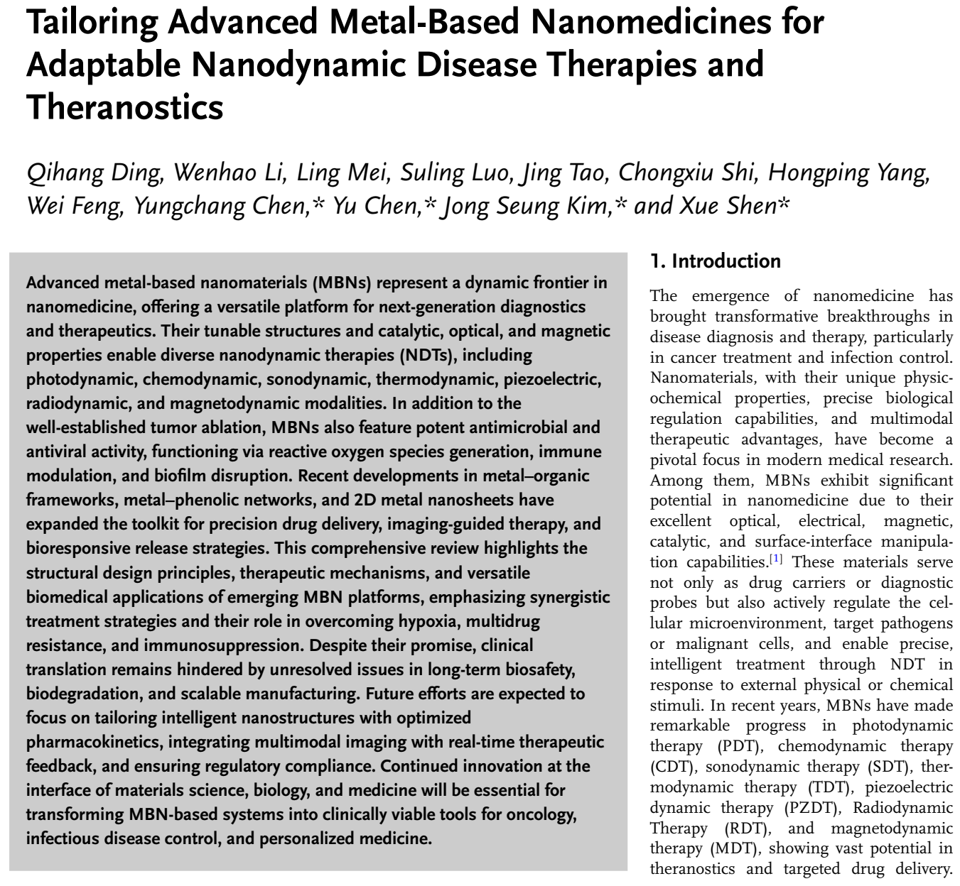 近日,我校药学院教师沈雪博士及其实验室团队与电子科技大学医学院、上海大学生命科学学院、以及韩国高丽大学化学系合作,在国际顶级学术期刊Advanced Materials(中科院一区Top期刊,IF=26.8)发表题为"Tailoring Advanced Metal-Based Nanomedicines for Adaptable Nanodynamic Disease Therapies and Theranostics"的综述性论文。我校教师沈雪博士为该论文的末位通讯作者,太阳成集团tyc122cc入口为该成果的第一单位。