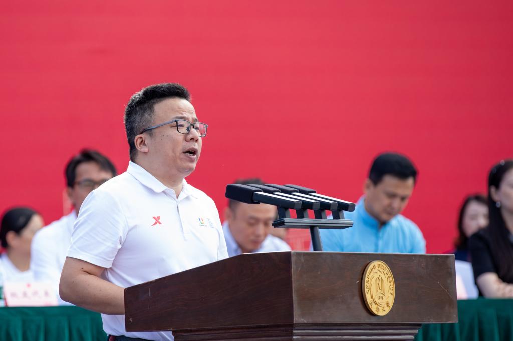 成都世运会中国团队飞盘队队长、成都飞盘大体育文化发展有限公司创始人、2017级休闲体育专业校友刘波致辞。他说,在今年的成都世运会上,有幸入选团队飞盘中国代表队并担任队长,与来自母校的学弟学妹在世界级赛事的舞台上并肩作战,并取得历史性突破。回首来时路,每一个成长脚印都离不开母校的滋养。他希望学弟学妹们勇敢尝试,寻觅心中所爱;持之以恒,让热爱催化成长;统筹兼顾,珍视情谊,建立深厚的师生与同窗之缘。