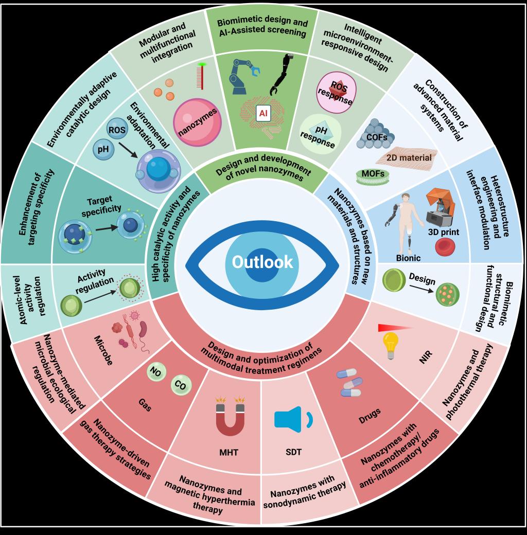 尽管其在规模化生产、长期毒理学和体内代谢机制等方面仍面临临床转化挑战,但纳米酶所代表的“催化-免疫-代谢”整合型治疗策略,已为下一代精准医学注入强劲动力。近日,我校研究人员系统撰写的综述文章,全面总结了纳米酶在非肿瘤性疾病治疗中的最新进展。该文详细阐释了纳米酶的分类与催化机制,重点剖析其在抗氧化应激、抗炎及免疫调节方面的作用,并涵盖其在心脑血管疾病、神经退行性疾病、代谢性疾病、炎症性肠病、皮肤病、呼吸系统疾病及眼科疾病中的具体应用与治疗效果。此外,文章还深入探讨了纳米酶的结构-功能关系、靶向策略、智能释放系统及多模态诊疗整合方案,并对生物相容性、体内清除途径与长期稳定性等临床转化关键问题予以评估。在文章最后的“展望未来“中,进一步提出仿生设计、人工智能辅助筛选、微环境响应型纳米酶构建以及多功能集成平台等前沿发展方向,为纳米酶技术的临床转化与产业化应用提供了可能的方向(图2)。