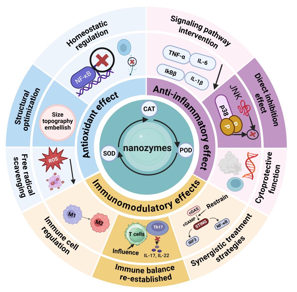 近年来,一类被称为“纳米酶”的人工模拟酶材料正迅速崛起,为上述治疗困境带来崭新解决方案。纳米酶不仅具备类似天然酶的催化性能,还具有结构可设计、生物相容性可调控等独特优势。它们能高效模拟超氧化物歧化酶、过氧化氢酶和过氧化物酶的功能,在复杂病理微环境中精准清除过量的活性氧/氮物种,重塑炎症微环境,恢复免疫与代谢稳态。