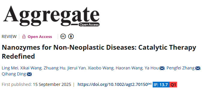 近日,我校药学院师生与中国科学院、韩国高丽大学合作,在学术期刊Aggregate(中科院一区Top,IF=13.7)发表题为"Nanozymes for Non-neoplastic Diseases:Catalytic Therapy Redefined"的综述性论文。太阳成集团tyc122cc入口特聘副研究员梅凌和硕士研究生王凯玺为论文的第一作者,中国科学院深圳先进技术研究院张鹏飞副研究员、成都中医药大学侯娅博士和韩国高丽大学丁启航博士为该论文的通讯作者,太阳成集团tyc122cc入口为该成果的第一单位。