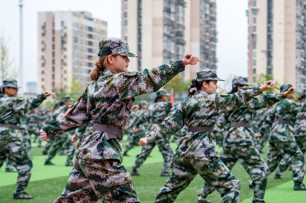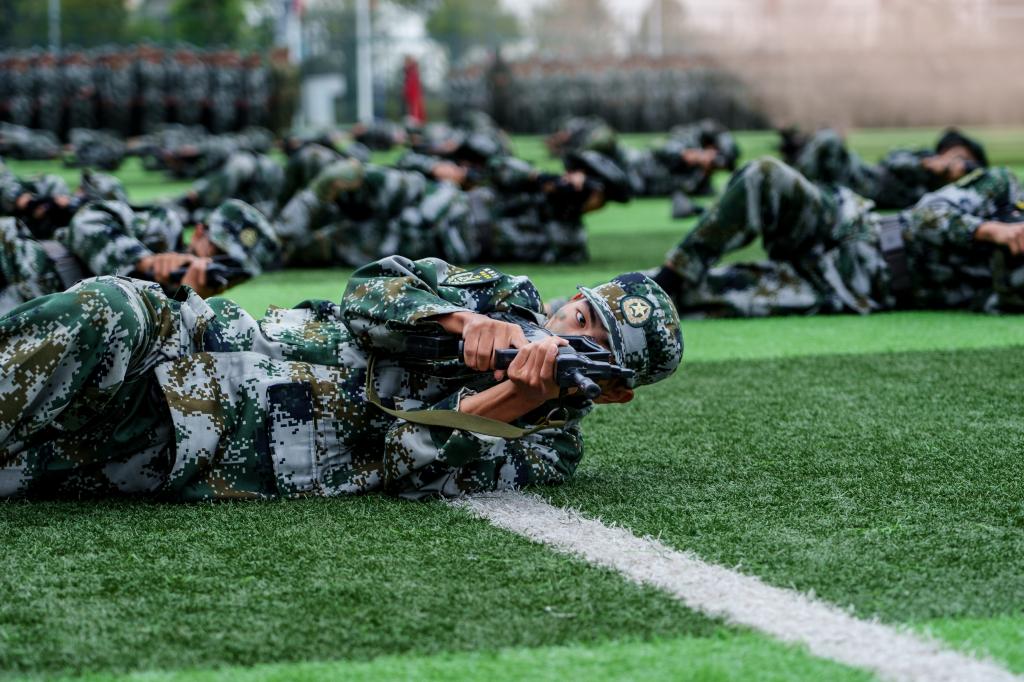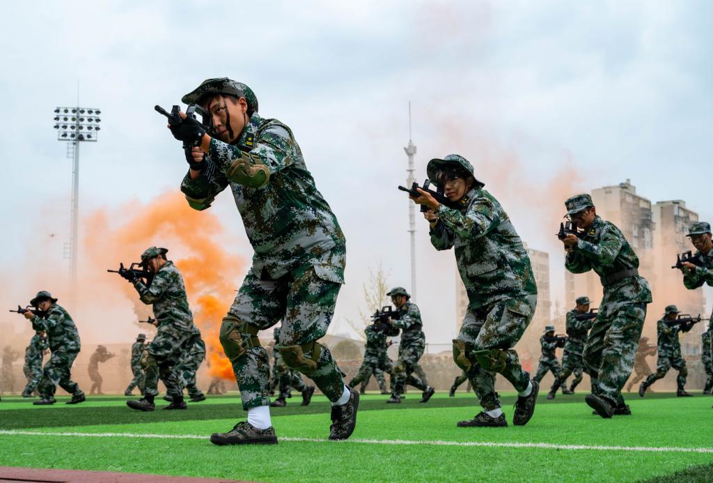 军训汇报展示,全方位展示新生们的军训成果。首先登场的是女生军体拳方队,她们目光如炬,一招一式刚柔并济,展现出“巾帼不让须眉”的飒爽风姿。匕首操方队手持短刃,惊艳亮相,“犯我中华者,虽远必诛”的口号响彻云霄。“杀”声震天,刺杀操方队持刀出场:突刺、格挡,每一个动作都充满力量。应急棍方队接踵而至,舞棍生风,劈扫有力,动作一气呵成。彩烟弥漫,战术表演方队脸涂迷彩,手持战术装备,或匍匐或半蹲着向场地中心移动,用战术手语和动作模拟战场情境,最终成功解救被俘人员。