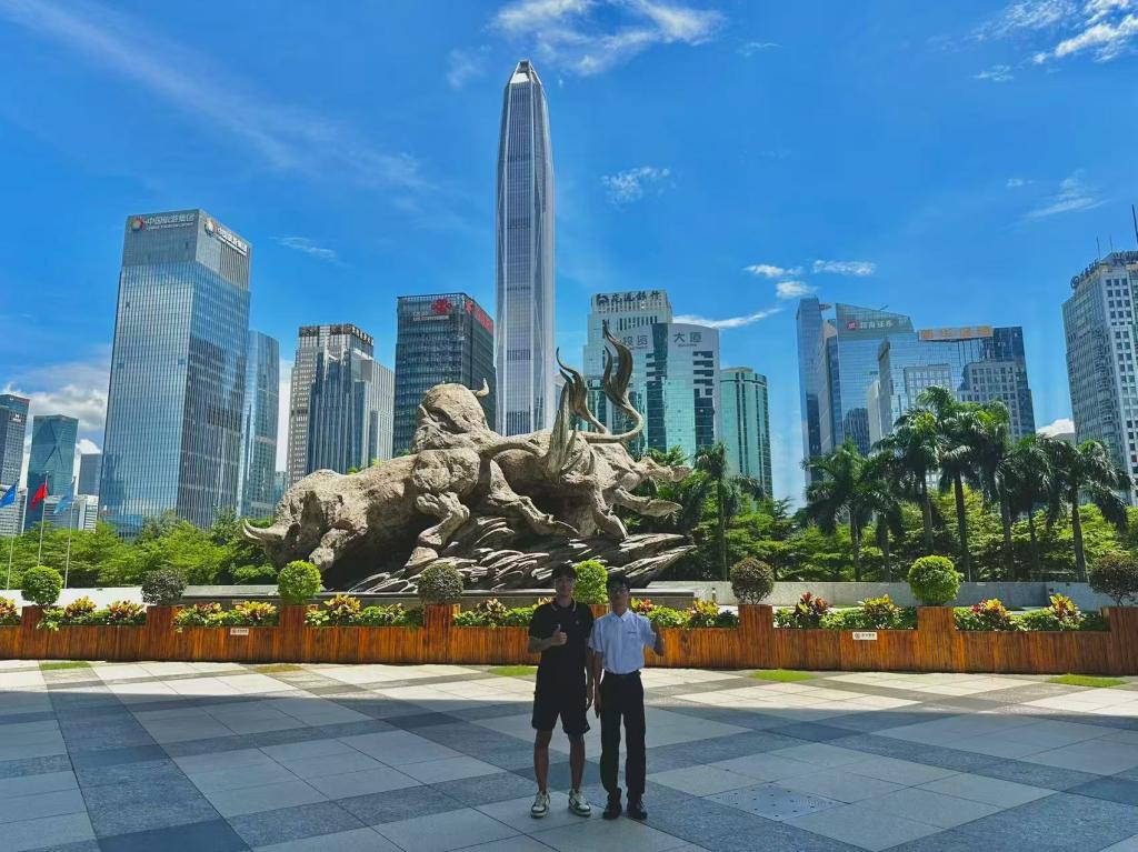 在中国建设银行深圳分行实习期间,和室友高应宝在公司旁边的深圳证券交易所的拓荒牛拍照留念。