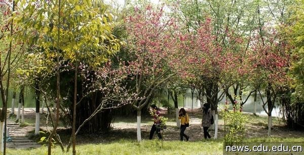 (图/饶民)行走在校园的花香小径中。