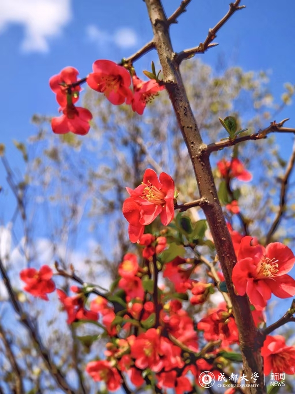 贴梗海棠以蓝天为幕,在阳光下肆意生长