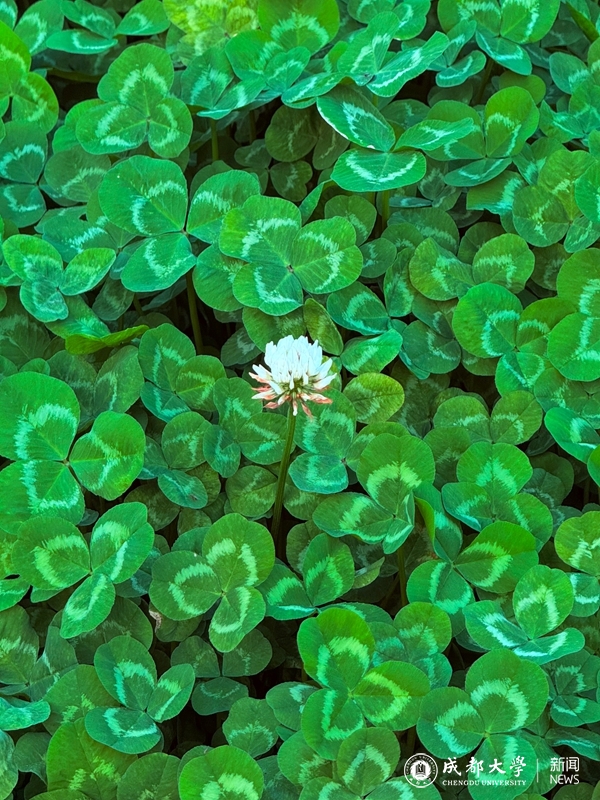 在绿意盎然的三叶草海洋中,一朵白色小花悄然绽放