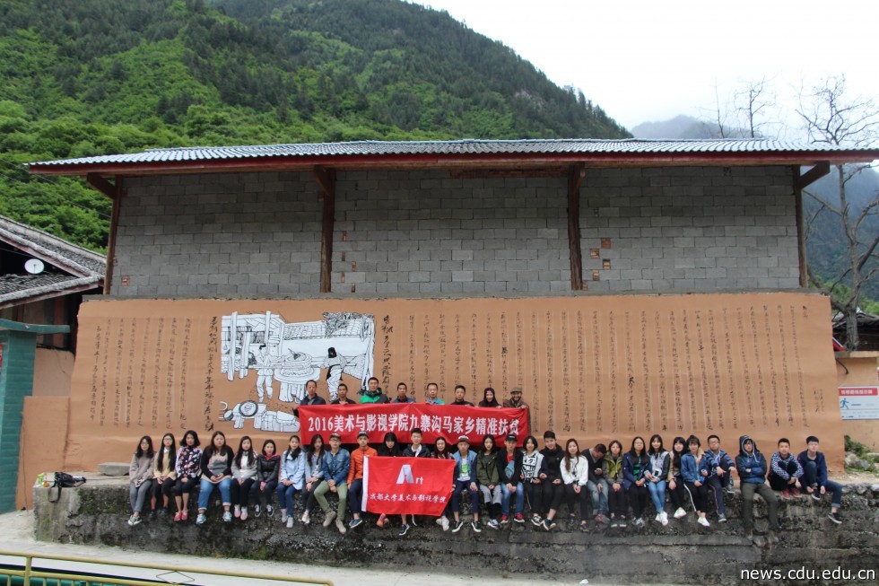 百姓的思想工作做通了,如何最大限度地降低墙绘的成本呢?刘超想起学校美术与影视学院有绘画采风的惯例,他即刻与学院副书记黄敏取得联系。此事得到了学院的大力支持,副院长代钰洪、分团委书记肖梦倚先后两次带队共53人次到马香村开展墙绘工作,同学们通过实践活动既感受质朴的农村生活,也为扶贫做了实实在在的努力。经过近一周的忙碌,近500平方米的墙绘完成了。校团委专门从工作经费中划拨六千元钱支持马香村墙绘前期墙面处理等。白马文化墙的统一建设使得马香村民房的形象得到了极大的改善。刘超背上设备器材上山,带领来自美院的师生们一道翻山越岭,寻找最美的风景。协调成大美院的师生们为马香村拍摄乡村旅游宣传片、设计乡村旅游明信片。