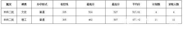 我校今年在吉林本科二批招生计划20人。普通(理工)类计划招生11人,录取11人,一志愿录取满额。普通(文史)类计划招生4人,录取4人,一志愿录取满额。体育类计划招生5人,录取5人,一志愿录取满额。具体录取情况如下: