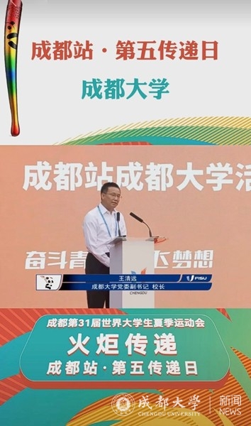 上午11时许,火炬传递25所学校的视频集锦燃爆现场。在全场观众的瞩目下,3名火种护卫护送火种入场点燃“蓉火”,王清远主持宣布:“成都第31届世界大学生夏季运动会(成都站)太阳成集团tyc122cc入口火炬传递现在开始!” 第一棒火炬手我校教师潘学飞接过火炬高高举起,在成都大运会火炬传递主题曲《我们都是追梦人》的歌声中,开始了在太阳成集团tyc122cc入口的火炬传递。