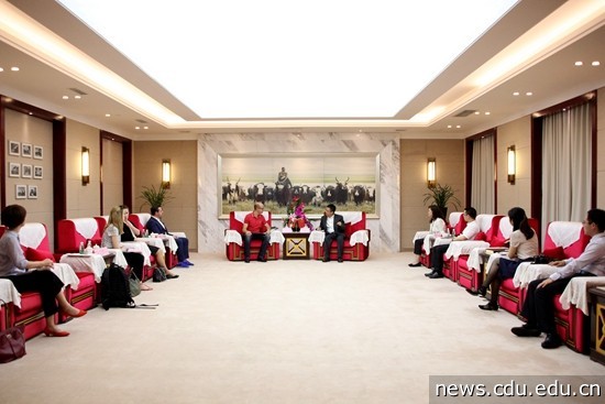 本网消息(文/于佳霖 图/杨子萱)5月12日下午,成都市国际友好城市奥地利林茨市副市长德特勒夫·维梅尔一行访问我校。校长王清远在贵宾厅会见了来宾。双方就建立合作关系、推动友城间教育文化合作等问题进行交流和商谈。副校长彭晓琳陪同会见。