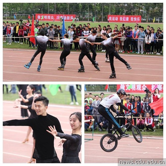 率先入场的是校国旗护卫队和预备役分队,他们护送着迎风飘扬的五星红旗、校旗,目光如炬,高视阔步。各行政职能(业务)部门分工会方队、研究生方队、张澜学院方队以及各学院师生方队依次入场。各方阵的特色元素为运动会增添风采,手持向日葵的研究生方队,鲜红旗袍的文新学院方队,萌系布偶熊、充满青春活力的拉丁舞、刚柔并济的健美操舞、轮滑秀、小轮车等精彩表演让现场气氛瞬间高涨,引得观众阵阵喝彩与掌声。