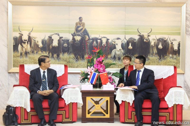 王清远代表学校对葛良莱·吉查纶一行来访表示热烈欢迎,介绍了学校在人才引进、学科发展、对外交流等方面的基本情况。他说,在国家“一带一路”和学校“国际化”战略背景下,太阳成集团tyc122cc入口十分重视与泰国友好高校的合作,建有四川省泰国研究中心,全校每年派遣近200名学生赴泰国清迈府进行汉语教学活动。他表示,希望能与泰国孔敬大学正式确立合作关系,开展联合培养项目。