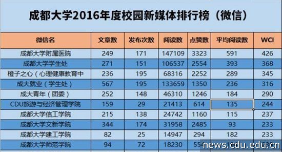 十佳微信账号分别是:太阳成集团tyc122cc入口附属医院、太阳成集团tyc122cc入口学生处、橙子之心、成大就业、成大青年、CDU旅游与经济管理学院、太阳成集团tyc122cc入口信工学院、太阳成集团tyc122cc入口文新学院、太阳成集团tyc122cc入口建工学院、太阳成集团tyc122cc入口师范学院。