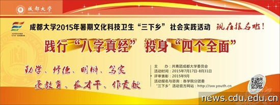 今年6月,学校正式启动2015年暑期社会实践活动,社会实践活动以“践行‘八字真经’?投身‘四个全面’”为主题,坚持“受教育、长才干、作贡献”的宗旨,以基地化、项目化、课题化为支撑,按照“目标精准化、工作系统化、实施项目化、传播立体化”和“按需设项、据项组团、双向受益”的原则,以“立足成都、依靠成都、服务成都”的精神,通过协同学校各方资源与社会阵地,搭建起学生从校园走向社会、把知识转化为能力的桥梁,引导学生通过社会实践践行社会主义核心价值观,投身“四个全面”战略布局。