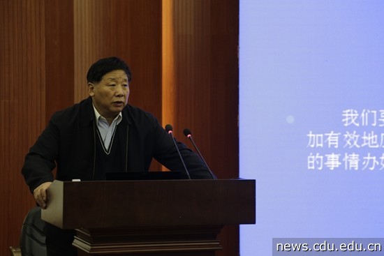 本网消息(文/尼可 图/罗芹)11月13日下午,成大讲坛迎来开办以来首位正部级领导主讲人,中央社会主义学院党组书记、第一副院长叶小文。叶小文用两个半小时的时间,作了题为《大鹏欲展翅,天高任鸟飞——中国为什么要构建“一带一路”》的精彩讲座。党委副书记宋辉主持讲座。在家校领导、中层干部和师生代表共计300余人现场聆听讲座。