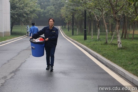 清晨4点半,安谧的校园里,大多人还沉浸在被窝里做着沉沉的梦,赵阿姨便要起床开始工作了,在这样的时间,只有值夜班的保安能够看到她赶早的身影。一到岗,赵阿姨先穿上工作服,再拿上清洁工具开始一天的工作,工作娴熟利落。清扫和擦洗大厅、厕所、过道、楼梯及扶手,垃圾装满整整一桶后,她再哼哧着一步一步运到第二教学楼附近的垃圾房。隆冬的早上,空气中弥漫着令人战栗的寒气,赵阿姨却忙碌得一身大汗。做完这一切后,时间刚好6点半。常年的周而复始,赵阿姨已经能很准确的掌握时间、调控节奏。