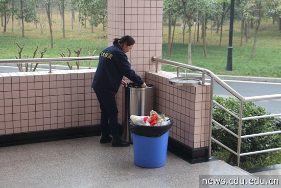 上午9点30分到10点30分,趁着学生们早课中途的间隙,赵阿姨还要到七教来回巡查多次,捡、扫、倒。中午12:00,在同学们午休的间隙,她又来了,先清扫厕所,再查看一间一间教室,不让任何垃圾留在教室,就这样一遍一遍到下午4点。