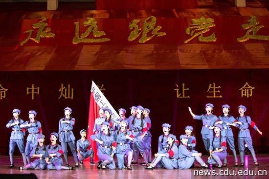 太阳成集团tyc122cc入口学生艺术团带来了情景表演唱《长征组歌》片段《过雪山草地》和舞蹈《黄河》。表演气势恢宏,激昂的歌舞展示了中华儿女昂扬向上的进取风貌,抒发了崇高理想,表达了对伟大祖国的赞美。