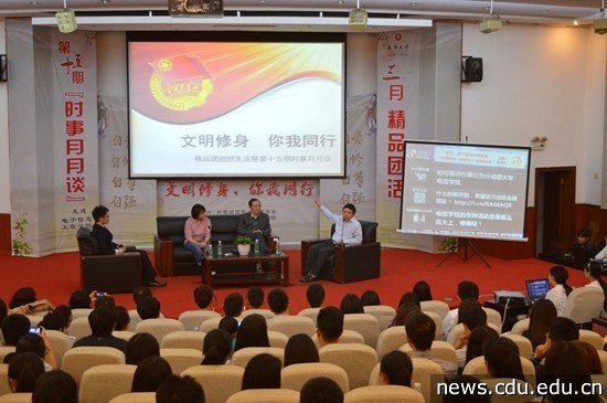 本次活动以“文明修身、你我同行”为主题,邀请文学与新闻传播学院院长谭平教授、经济管理学院张强教授、文学与新闻传播学院王珏老师担任主讲嘉宾。三位嘉宾围绕“大学生文明修身意识淡薄的原因、大学生怎样加强文明修身、如何将国学精粹融入到大学生文明修身教育、大学生如何做到网络文明”等问题与现场师生进行了热烈的交流探讨。谭平教授提出大学生要“懂规矩,有底线,有目标,有教养”的修身建议;张强教授提出“修身必有福报”,大学生要争做“现代绅士”和“当代大家闺秀”;王珏老师强调大学生要遵守“现代契约精神”,守住现代交往的契约底线,争做不同形式的文明人。