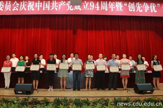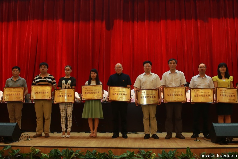 校党委对文新与新闻传播学院党委等9个先进基层党组织、王霞等12个优秀党务工作者、龚梁科等11个优秀共产党员予以表彰。在欢快的乐声中主席台就坐领导一一为受表彰的先进基层党组织、优秀共产党员和优秀党务工作者颁奖。