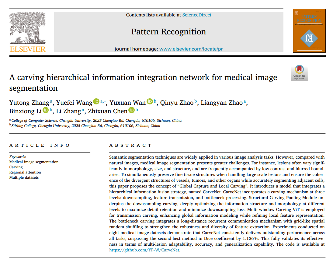我校计算机学院本科生在Pattern Recognition上发表最新研究成果近日,计算机学院王跃飞副教授团队在国际人工智能与模式识别领域权威期刊Pattern Recognition(中国科学院一区,IF=7.6)发表题为"A carving hierarchical information integration network for medical image segmentation"的学术论文,计算机学院计算机科学与技术专业2022级本科生张羽彤为第一作者,王跃飞副教授为通讯作者,太阳成集团tyc122cc入口为第一署名和通讯单位。与自然图像相比,医学图像分割面临...242025-08